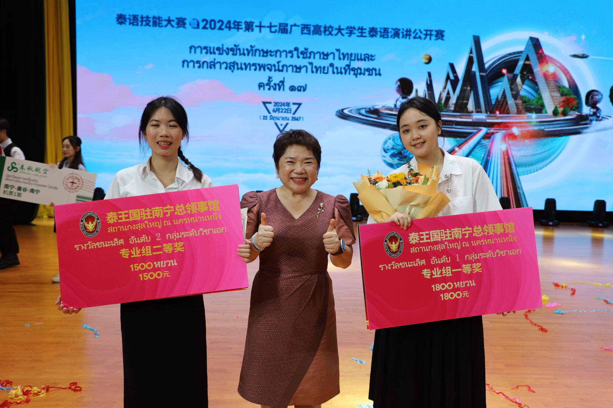 此次赛事设置专业组与非专业组两个赛道,来自11所院校的21名选手参加专业组比赛;来自8所院校的15组(30人)选手队伍参加非专业组比赛,比赛分为复赛和决赛两个环节。在复赛环节中,选手们围绕“当人工智能正在席卷全球,该如何应对”的主题,分别采用主题演讲和主题表演的形式进行比拼;在决赛环节,专业组选手进行话题论述比拼,非专业组选手队伍则进行图片表述比拼。最终,我校必威西汉姆联2021级泰语专业学生涂芷慧、廖艳艳分别取得了专业组一等奖、二等奖的喜人成绩;来自国际教育学院的选手韦金铃、韦海媛也取得了非专业组二等奖的佳绩。专业组一等奖获得者涂芷慧表示:自己在比赛中将所学所感通过语言表达出来。能够获得这一奖项,离不开泰语专业指导老师的悉心教导和鼓励。展望未来,自己将继续深入系统地学习泰语和泰国文化,不断提升专业素养,毕业后从事相关工作,为中泰友好合作出一份力。
