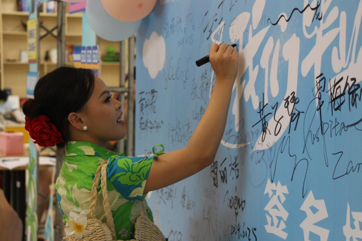 在“青春印记”环节,现场放置了一块签字板和两块毕业站牌以供毕业生们签名打卡。他们纷纷在签字板前打卡留念,为自己的大学生涯留下最后的影像。