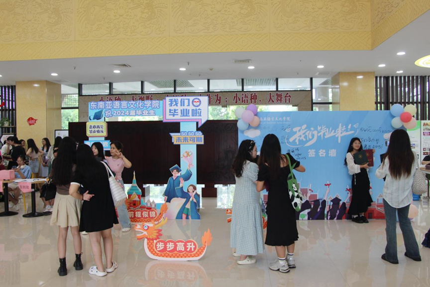 本次活动共有三个环节,分别是“逐梦路”环节、“青春印记”拍照打卡环节及盲盒抽奖环节。“逐梦路”环节中在东盟楼一楼举行,毕业生们跨越祝福区,寓意着毕业生们在未来将会福至心灵,前程似锦。