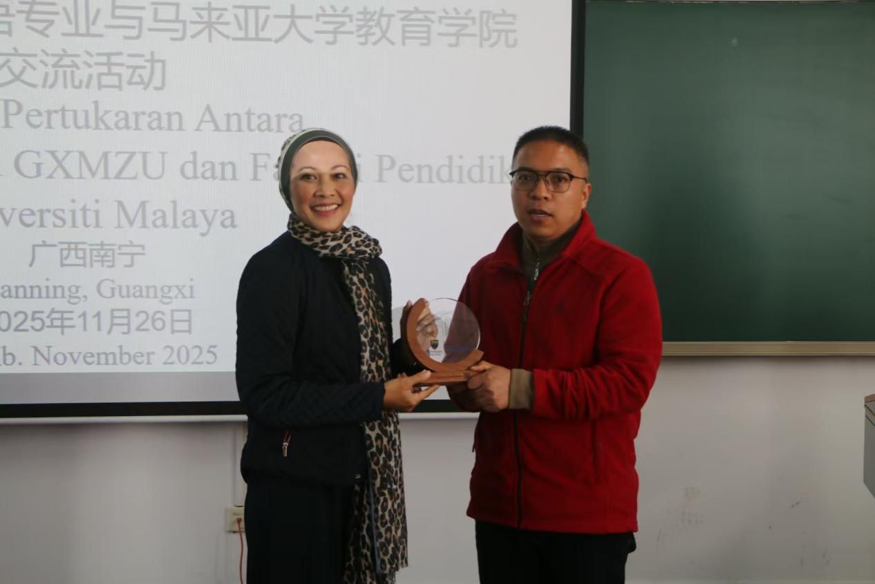 (马来亚大学教育学院语言与教育系沙妮娜主任赠送纪念品)