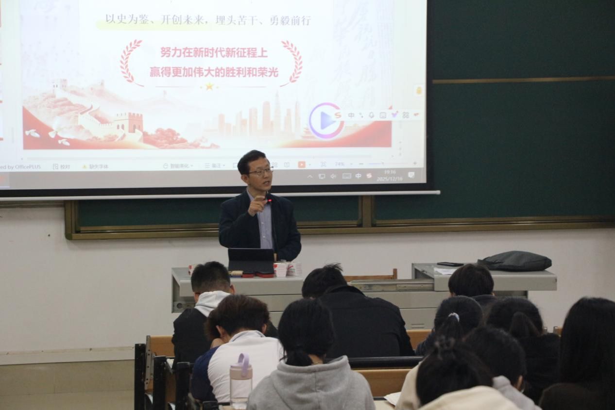 12月16日晚,学院党委书记吴大为在致远楼115教室为学生作以《纪念抗日战争胜利,坚定民族信念》为主题的“形势与政策”专题讲座,我院2022级全体学生参加讲座。