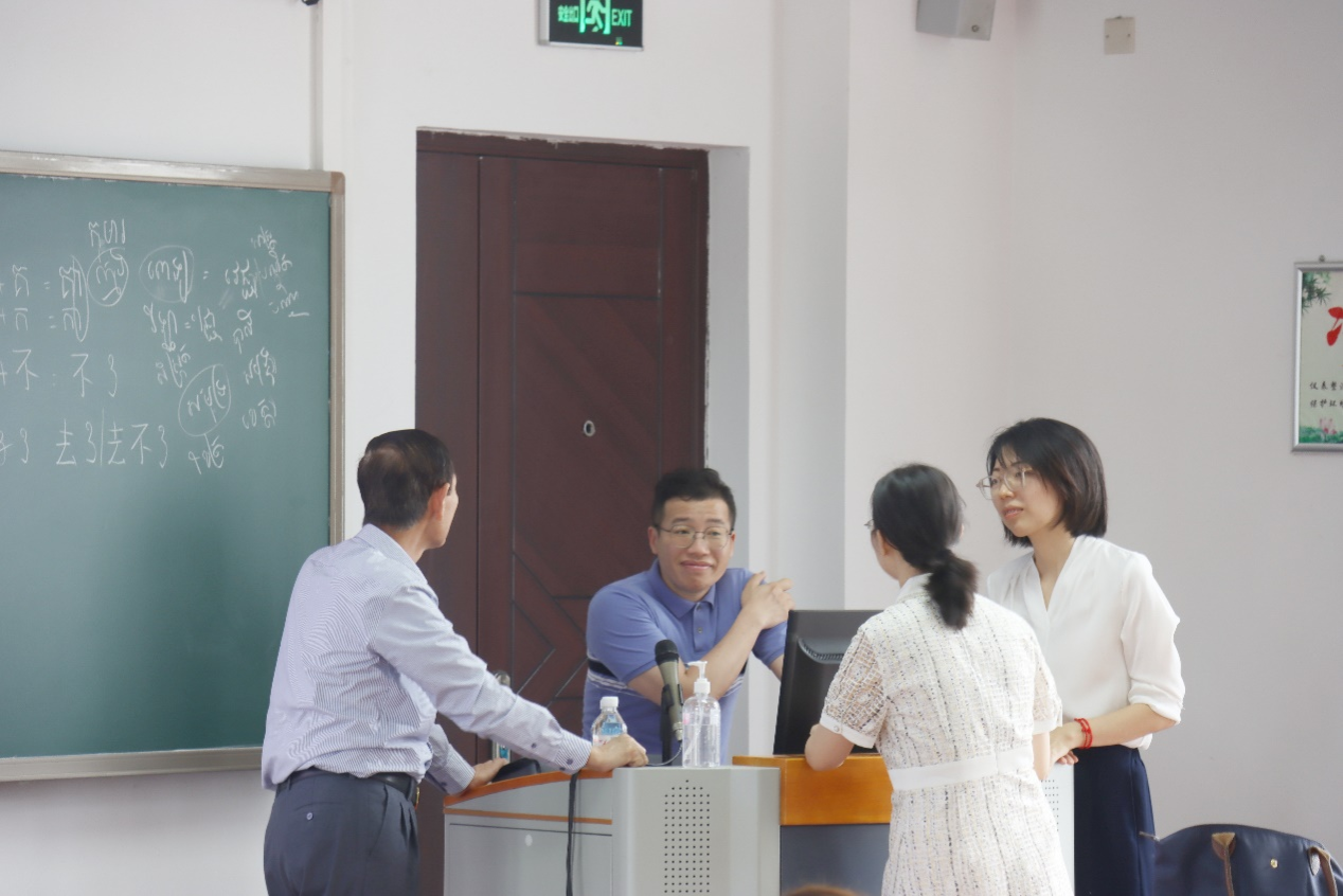 本次讲座分上下午两场举行,围绕柬埔寨语和泰语的关系以及柬埔寨语言的印度化两大主题。占松诺博士就柬泰两种语言之间的联系在地理位置、风俗习惯、宗教文化等方面展开讨论,在印度宗教文化对柬埔寨的影响以及柬埔寨印度化中对印度文化的选择和吸收上作出了解释。